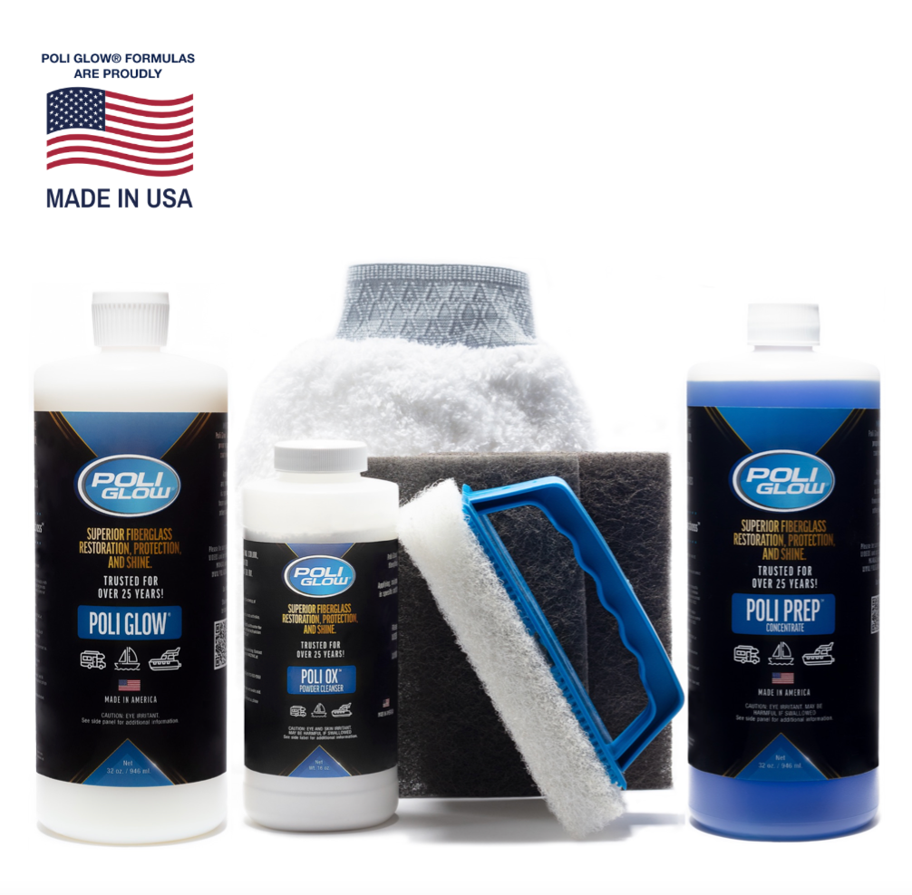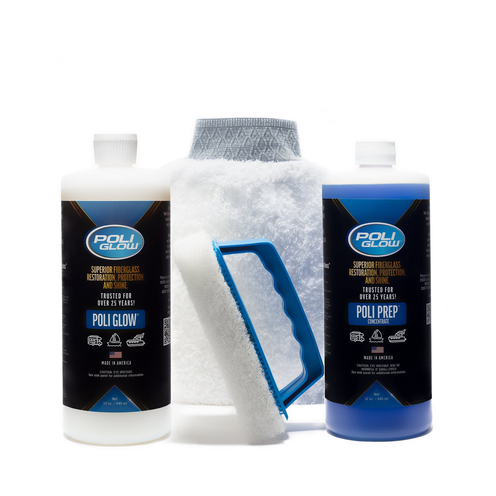 The Poli Glow® Deluxe Kit contains everything needed for Superior Fiberglass Restoration. Remove oxidation and stains, and apply the most Effective and Powerful Sealing Protection, and Magnificent Shine. Transform and Resurrect your old, tired and faded Boat or RV to the Dominant Gloss that's Boss!